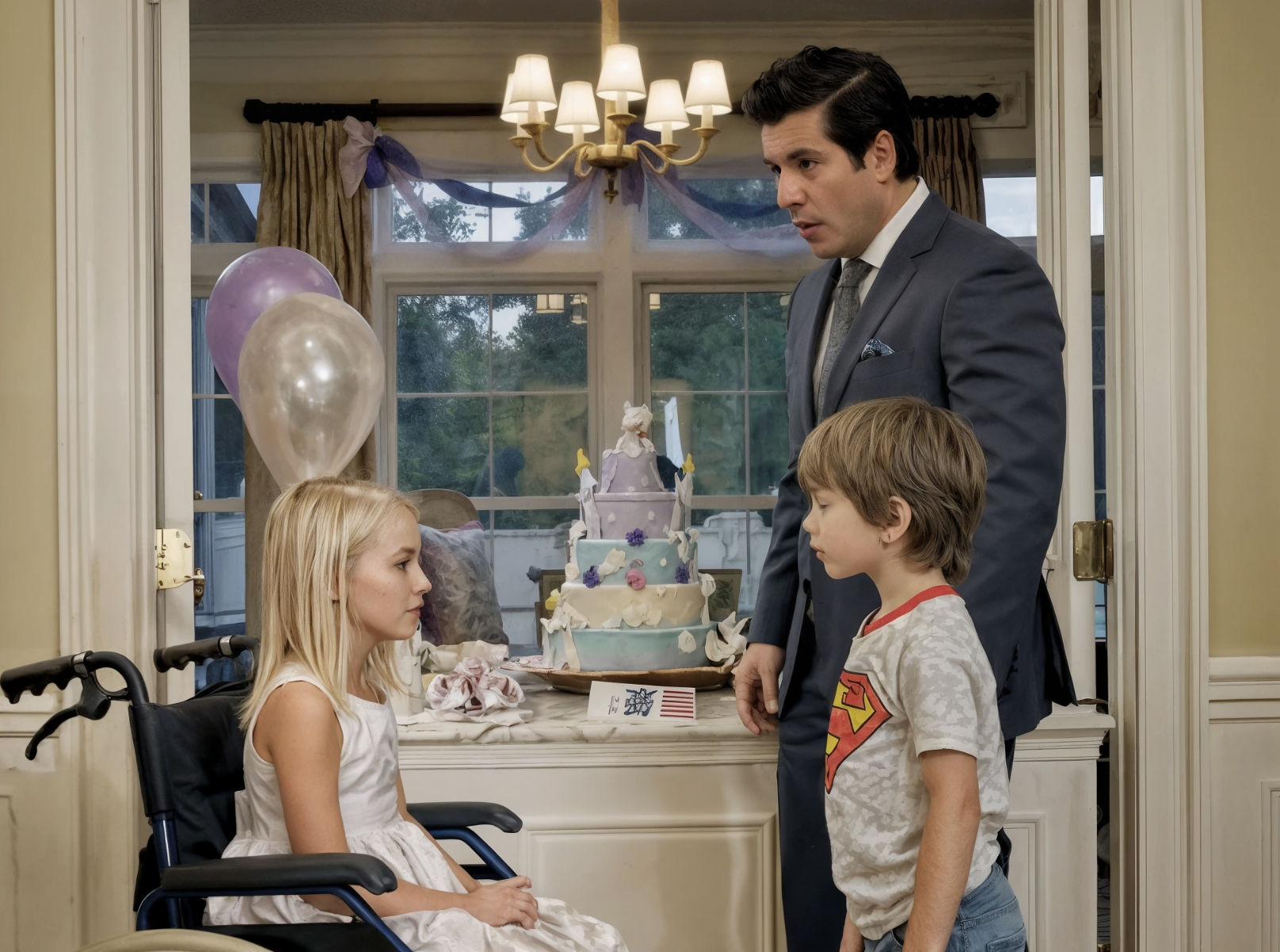 Robert Mitchell se tenait sur le seuil du grand salon de son manoir, le cœur s’alourdissant à chaque minute qui passait. Des ballons roses et violets flottaient sous le plafond cathédrale, et un magnifique gâteau en forme de château de princesse trônait intact sur la table à manger en acajou. Des guirlandes descendaient du lustre en cristal comme des larmes figées.