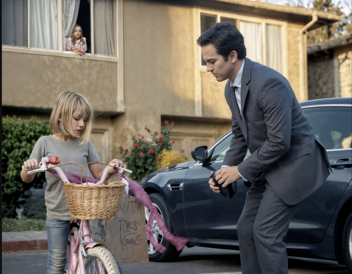 Les mots glissèrent des lèvres d’une fillette blonde de sept ans, ses petites mains tremblant tandis qu’elle tenait une pancarte en carton faite à la main. Arthur Stribbling, PDG millionnaire, avait garé sa luxueuse BMW après avoir assisté à une scène invraisemblable : une enfant vendait son vélo rose à l’angle d’une rue résidentielle de Fresno.