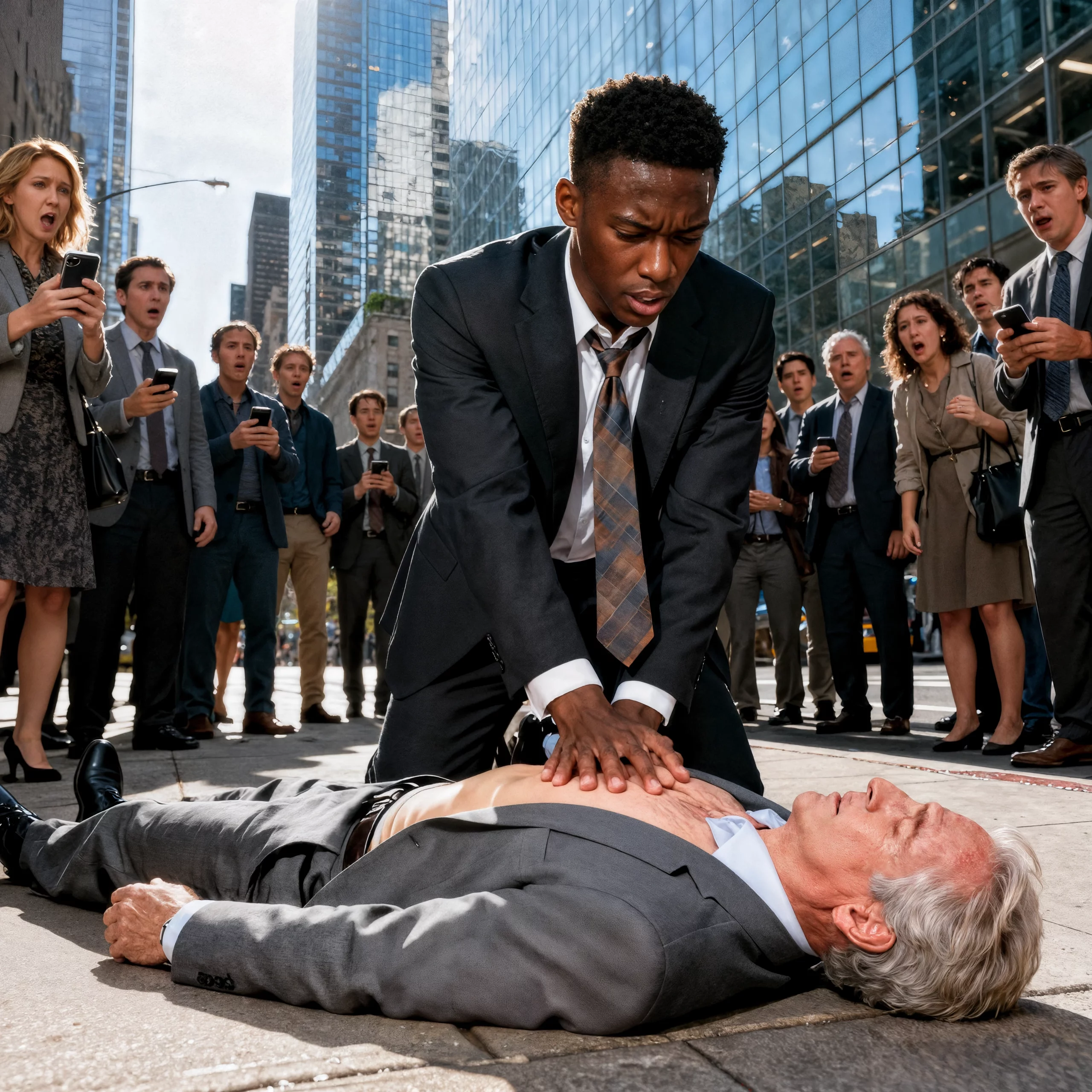 Un vieil homme en costume gris s’effondra soudain sur le trottoir. Les passants s’immobilisèrent. Certains crièrent, d’autres sortirent leur téléphone, mais personne ne bougea. Marcus, lui, n’hésita pas. Il laissa tomber sa mallette et se précipita vers l’homme.