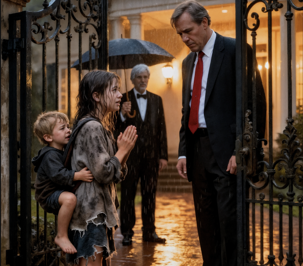 La petite voix tremblante venait du haut portail en fer de la propriété Beaumont, à San Diego. Sous les lumières du porche se tenait une fille maigre, pieds nus, dont l’ombre s’étirait sur les marches de marbre. Ses cheveux emmêlés et sa robe déchirée racontaient la dureté de la vie, mais ses yeux — calmes, sérieux — portaient une force tranquille bien trop mûre pour son âge.