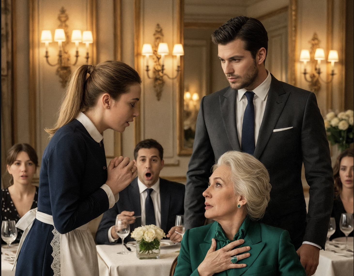 La soirée avançait, la tension aussi. Les serveurs insistaient, désignant les plats, répétant plus fort — comme si le volume pouvait franchir la barrière linguistique. Elle secoua la tête, les mains tremblantes, s’agrippa au médaillon et baissa les yeux, comme si elle espérait en silence qu’une voix, quelque part, la rejoigne.