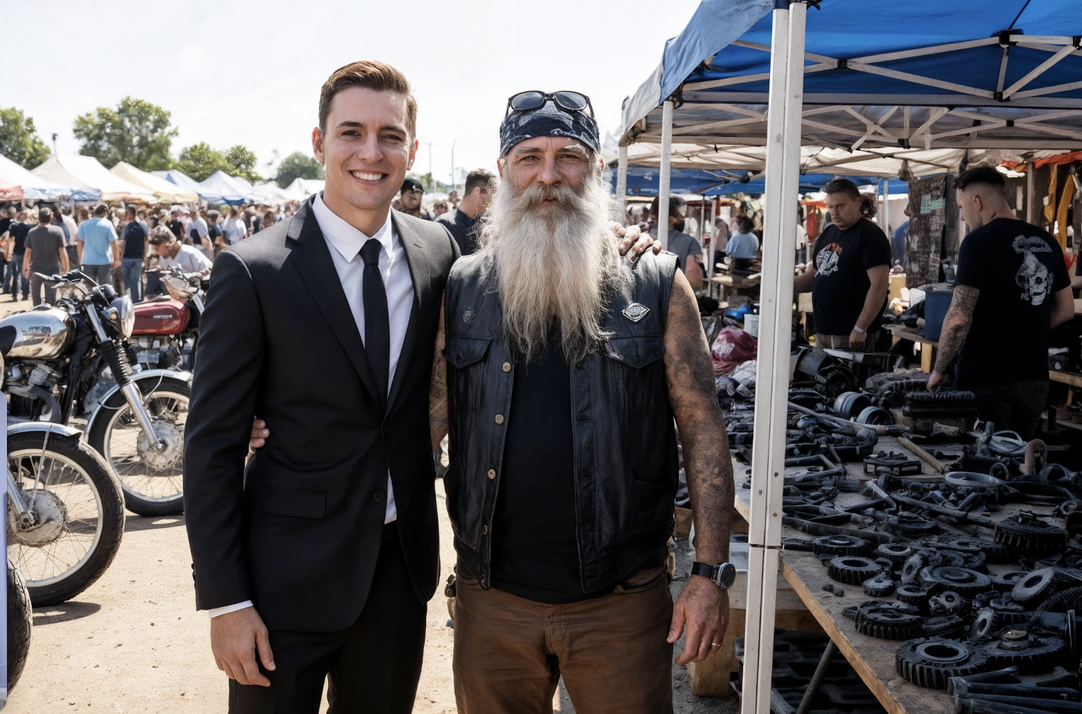 J’ai conduit jusqu’à l’atelier ce soir-là — cinq heures de route, encore en costume. Une trentaine de motards essayaient de réunir de l’argent pour un avocat.