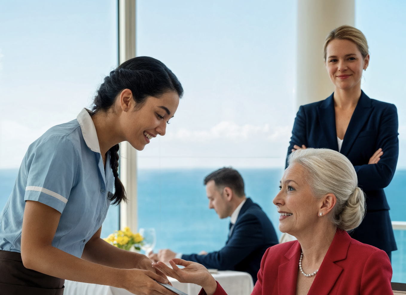 Ses yeux verts observaient le restaurant avec un mélange de curiosité et de quelque chose qu’Elena reconnut : la solitude. Mme Herrera se précipita vers la table principale. « Monsieur Valdés, quel honneur. Nous avons préparé notre meilleure table. » Julián acquiesça en guidant sa mère, mais Elena remarqua quelque chose : Carmen était déconnectée de la conversation. La table faisait face à de grandes fenêtres donnant sur la mer. Mme Herrera ordonna à Elena : « Tu t’occupes de la table de M. Valdés, et gare à toi si tu commets la moindre erreur : demain, tu es dehors. »