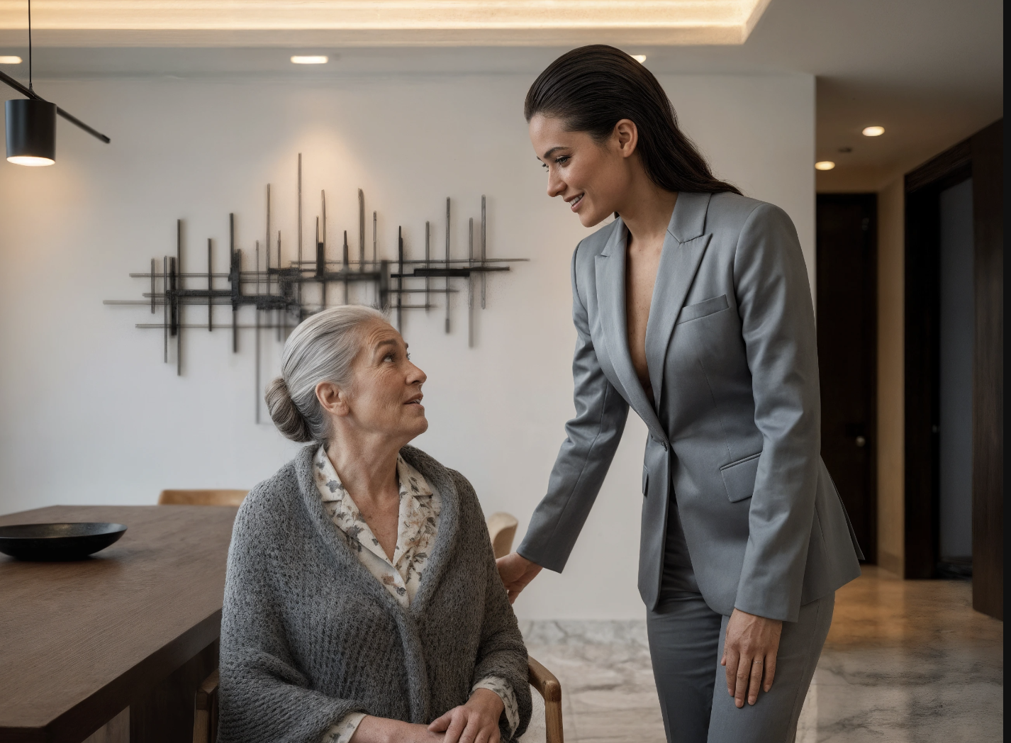 Après le dîner, pendant que Diego gérait un appel vidéo “urgent”, Mariana s’approcha soudain. Elle marchait d’un pas souple, calculé, comme une panthère dans un salon de luxe. Elle s’arrêta juste devant Doña Elena.