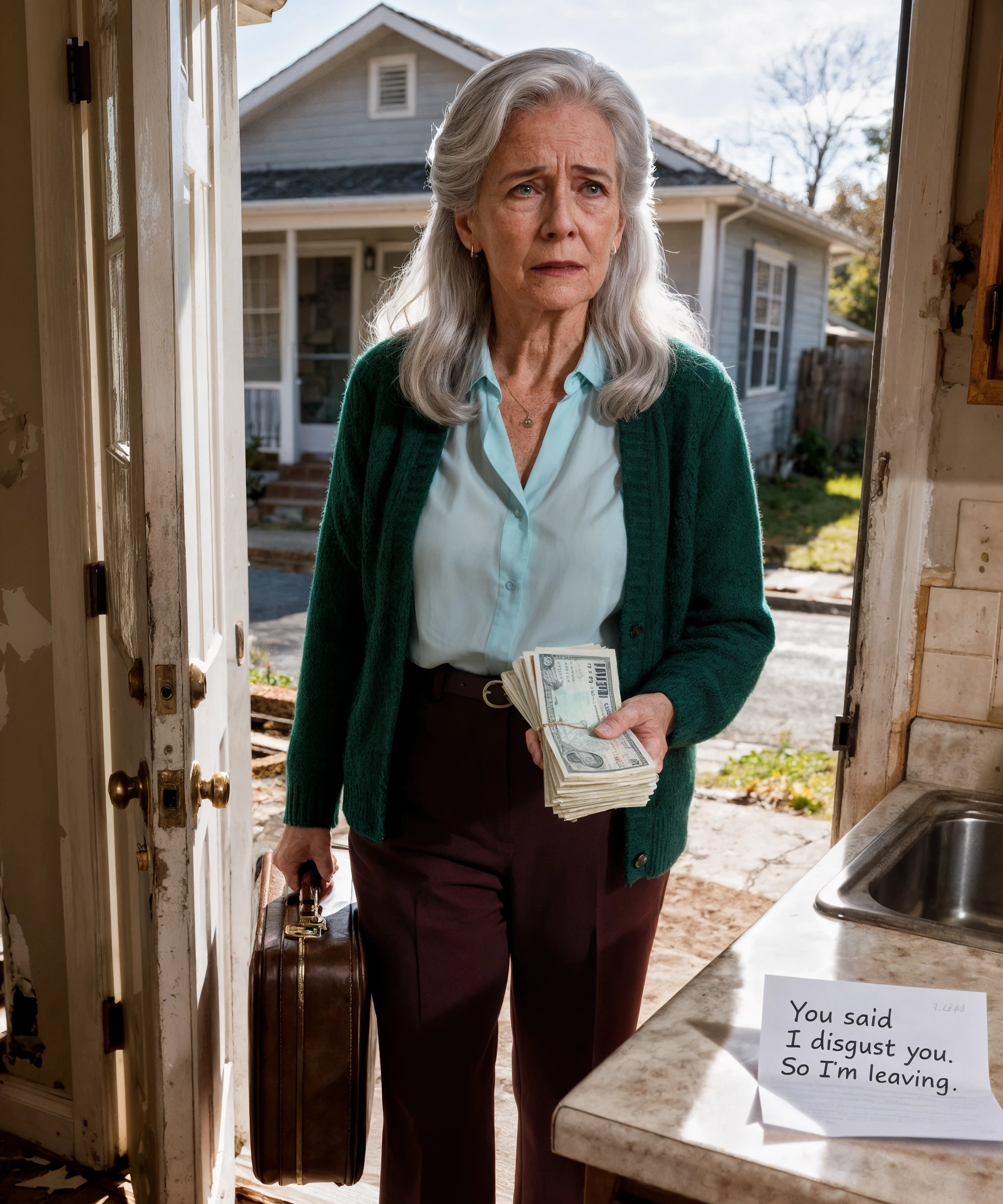 > *« Puisque ma présence te dégoûte, j’ai décidé de te donner ce que tu sembles désirer plus que tout : mon absence définitive. J’ai tout vendu. Je suis partie avec chaque dollar que j’ai gagné. Tu n’auras plus jamais à supporter cette “vieille femme dégoûtante”. »*