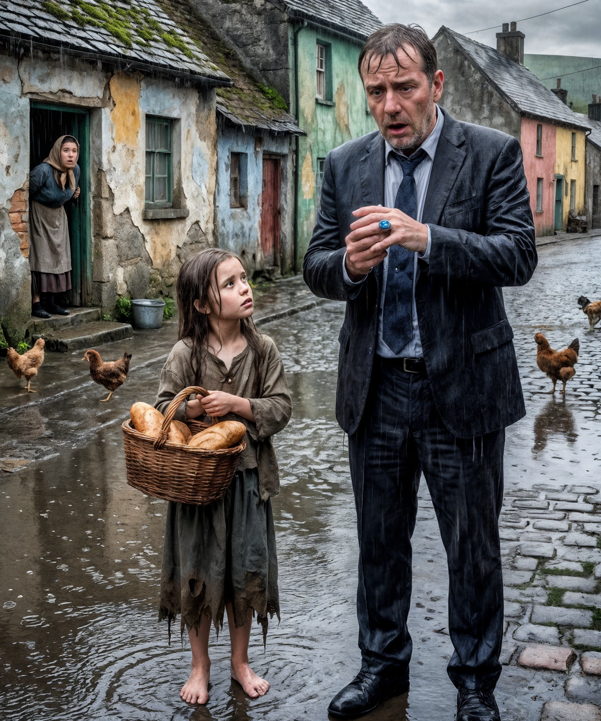 Sur le trottoir inondé, une jeune fille avançait, pieds nus, contre la pluie. Elle ne devait pas avoir plus de quinze ans. Sa robe était trop fine pour ce temps, collée à ses genoux, assombrie par l’eau. Ses cheveux—longs, noirs, lourds de pluie—se plaquaient sur ses joues et sa nuque. Elle se courbait légèrement, protégeant contre sa poitrine un panier tressé recouvert d’un linge blanc déjà détrempé.