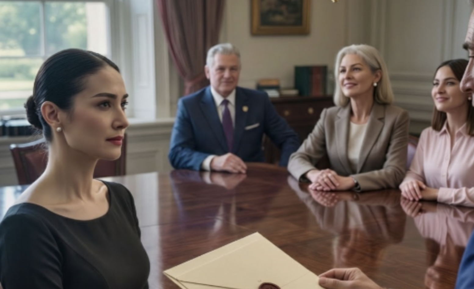 La table en acajou luisait sous le lustre de cristal, telle une nappe sombre figée — un lac d’ombre aux reflets rouges, presque sanguins. J’étais assise dans le fauteuil d’angle, les mains soigneusement jointes sur mes genoux, le dos droit, comme si la précision de ma posture pouvait empêcher le monde de me heurter. Le silence du cabinet d’avocats pesait comme une dalle. L’air portait l’odeur du cuir ancien et de la cire coûteuse — ce parfum particulier des fortunes installées et des secrets bien gardés.