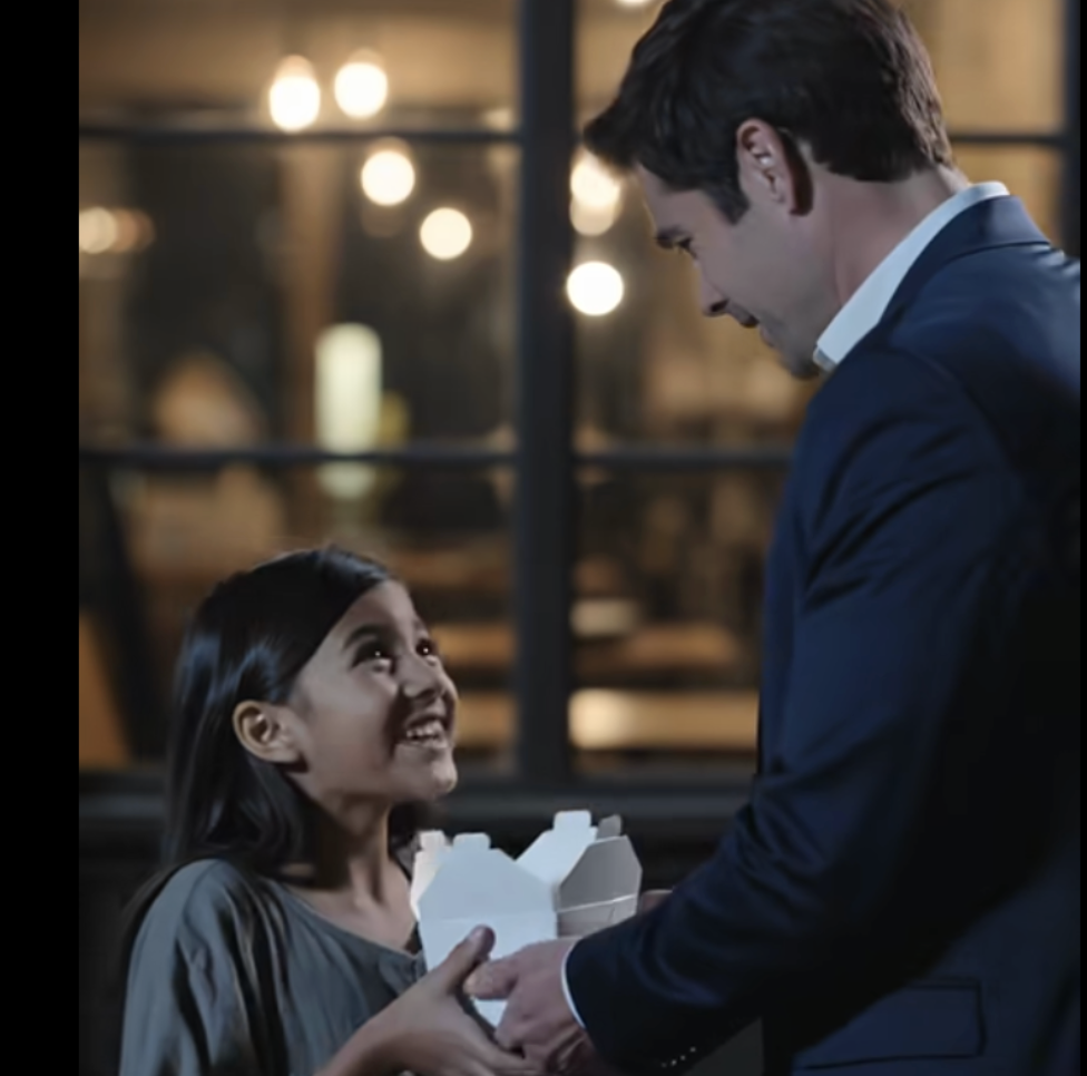 Juste un petit acte de gentillesse devant un restaurant doucement éclairé.